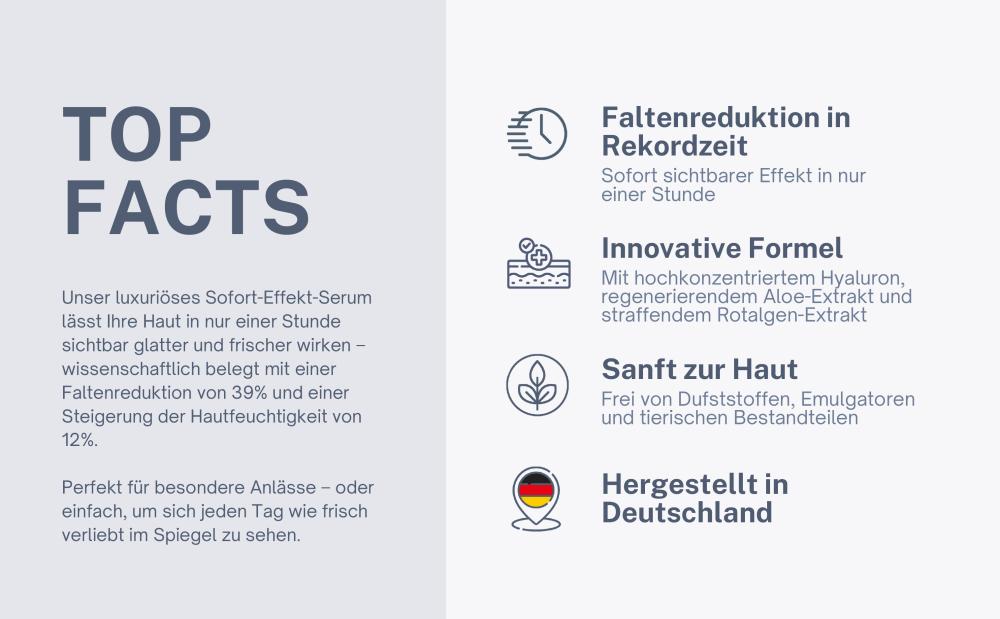 Faltenreduktion in Rekordzeit – Wissenschaftlich bestätigtErlebe die Kraft unseres sofort wirksamen Antifalten-Serums! Die innovative Formel mit hochkonzentriertem Hyaluron, regenerierendem Aloe-Extrakt und straffendem Rotalgen-Extrakt reduziert nachweislich Falten um bis zu 39 % in nur 60 Minuten – dermatologisch getestet und belegt. Die seidige Textur verschmilzt sofort mit der Haut, spendet intensive Feuchtigkeit und sorgt für ein sichtbar glatteres, frischeres Hautbild. Ideal für besondere Anlässe – oder einfach, um jeden Tag mit einem strahlenden Teint zu beginnen. Hochwirksame Pflegeformel für jede Haut